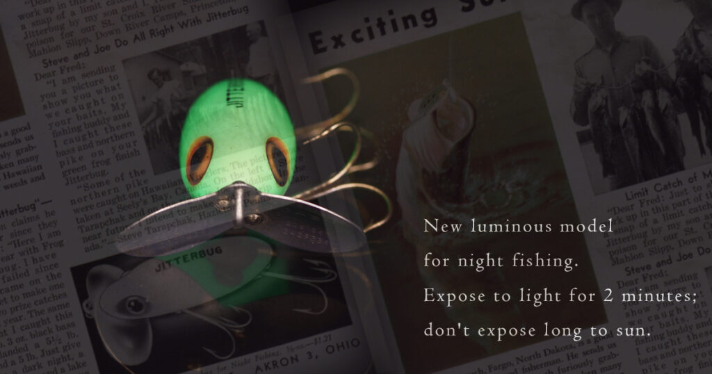 “New Luminous Jitterbug for Night Fishing. 5/8-oz. — $1.21”