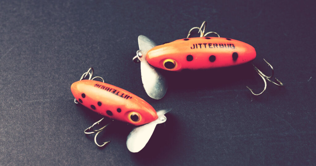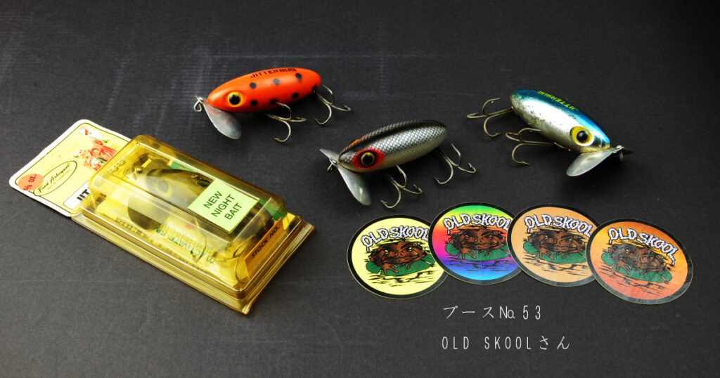 で、私のお目当ては53番ブースのOLD SKOOL(オールドスクール)さん。ドキドキしながら覗いてみる、あ!やっぱりあった。ブース奥のタックルボックスに溢れんばかりのジッターバグ。いきなり№44 Yellow/Black dots (60年代の超レアカラー)がお出迎えしてくれたものの予算オーバーであえなく撃沈。BUT、BUTT、さすがの品揃えで欲しいカラーがどんどんと出てくる。